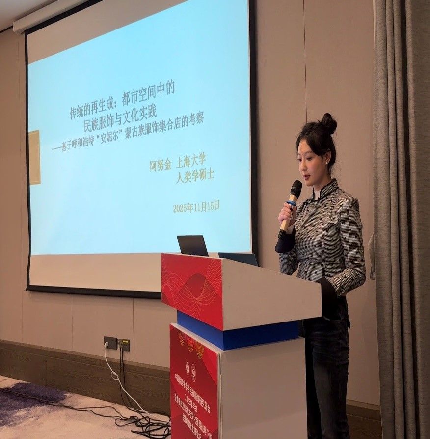2025年11月15日,2024级硕士研究生阿努金参加“中国民族学学会民族服饰研究分会2025年年会”,在会议上作关于《传统的再生成:都市空间中的民族服饰与文化实践-基于呼和浩特“安妮尔”蒙古服饰集合店的考察》的汇报。