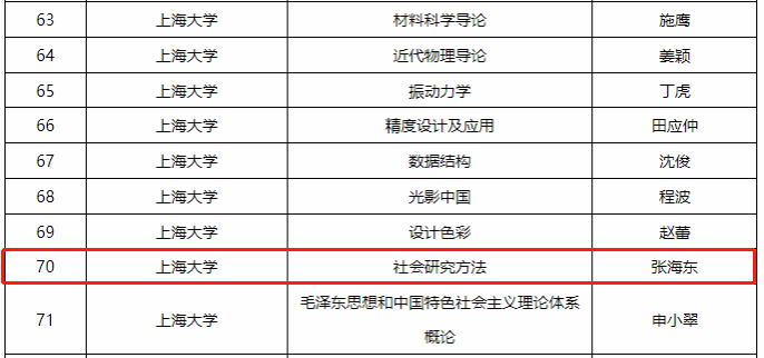 2023年1月29日,上海市教育委员会发布《上海市教育委员会关于公布2022年度上海高等学校一流本科课程认定结果的通知》(沪教委高〔2023〕2号),hth网页版最新登录地址共有22门课程被认定为2022年度上海高等学校一流本科课程,其中优质在线课程1门,线下课程9门,线上线下混合式课程10门,社会实践课程1门,示范性全英语课程1门。其中,我院张海东教授负责的线下课程《社会研究方法》被认定为2022年度上海高等学校一流本科课程。