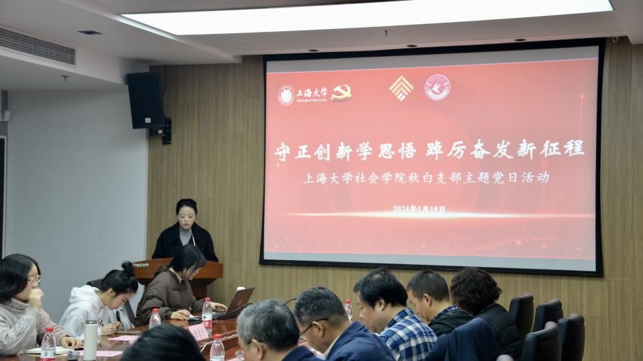 习近平总书记在发表2024年新年贺词时曾指出:“2023年,我们接续奋斗、砥砺前行,经历了风雨洗礼,看到了美丽风景,取得了沉甸甸的收获”。为全面贯彻落实党的二十大精神和二十届二中全会精神,2024年1月19日上午,社会学院秋白党支部开展“守正创新学思悟 踔厉奋发新征程”主题党日活动,共同回顾支部过去一年的工作情况,展望未来的发展前景。校党委书记成旦红,校党委常委、组织人事部常务副部长、组织处处长沈艺,党政办公室副主任凌长臣,秋白书院院长肖瑛,社会学院领导班子成员,辅导员老师以及秋白党支部学生党员共同出席本次活动。活动由社会学院秋白党支部书记王达然主持。